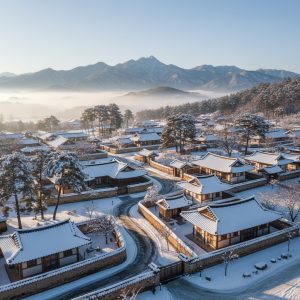 제가 만들 조합은 한국 전통 마을 + 겨울 눈 풍경 + 드론 뷰 를 합친 조합으로 이질감은 들지만 몰입감 넘치는 이미지를 만들어 볼게요.